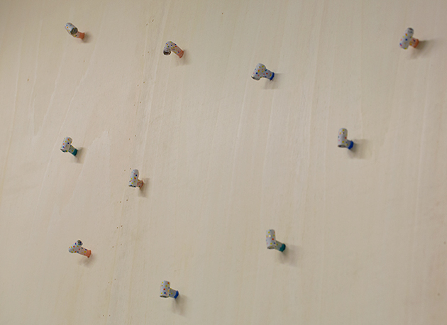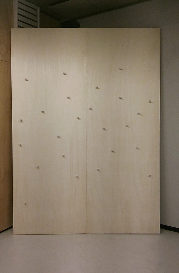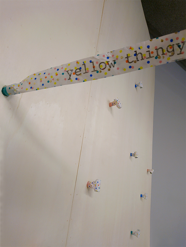 Twenty-one party blowers stick out of a wooden wall. A fragmented narrative formed by secret messages inside the party blowers is progressively revealed as they unroll.